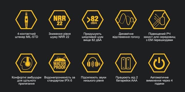 Активний захист слуху: NRR 22 дБ (SNR 27 дБ).