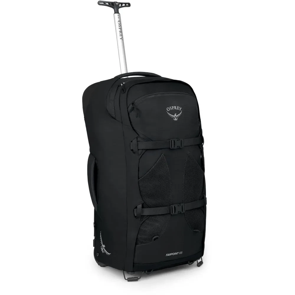 Завдяки гібридній конструкції даної моделі ви можете відразу після виходу з літака вирушити в гірський похід. Проста зручність використання валізи та рюкзака значно полегшує подорожі. Валіза Osprey Farpoint Wheels 65, завдяки призначенню для подорожей, виготовлена з комбінованого нейлону двох щільностей. Це означає, що ця модель витримає складні умови кожної вашої подорожі. Ви можете тягнути її на колесах або носити на спині. Основа шасі валізи - загартований матеріал і широкі колеса. Це означає, що ви можете подолати навіть найвибоїстіші тротуари та стежки. За зручність користування валізою відповідає телескопічна ручка у формі літери "Т".